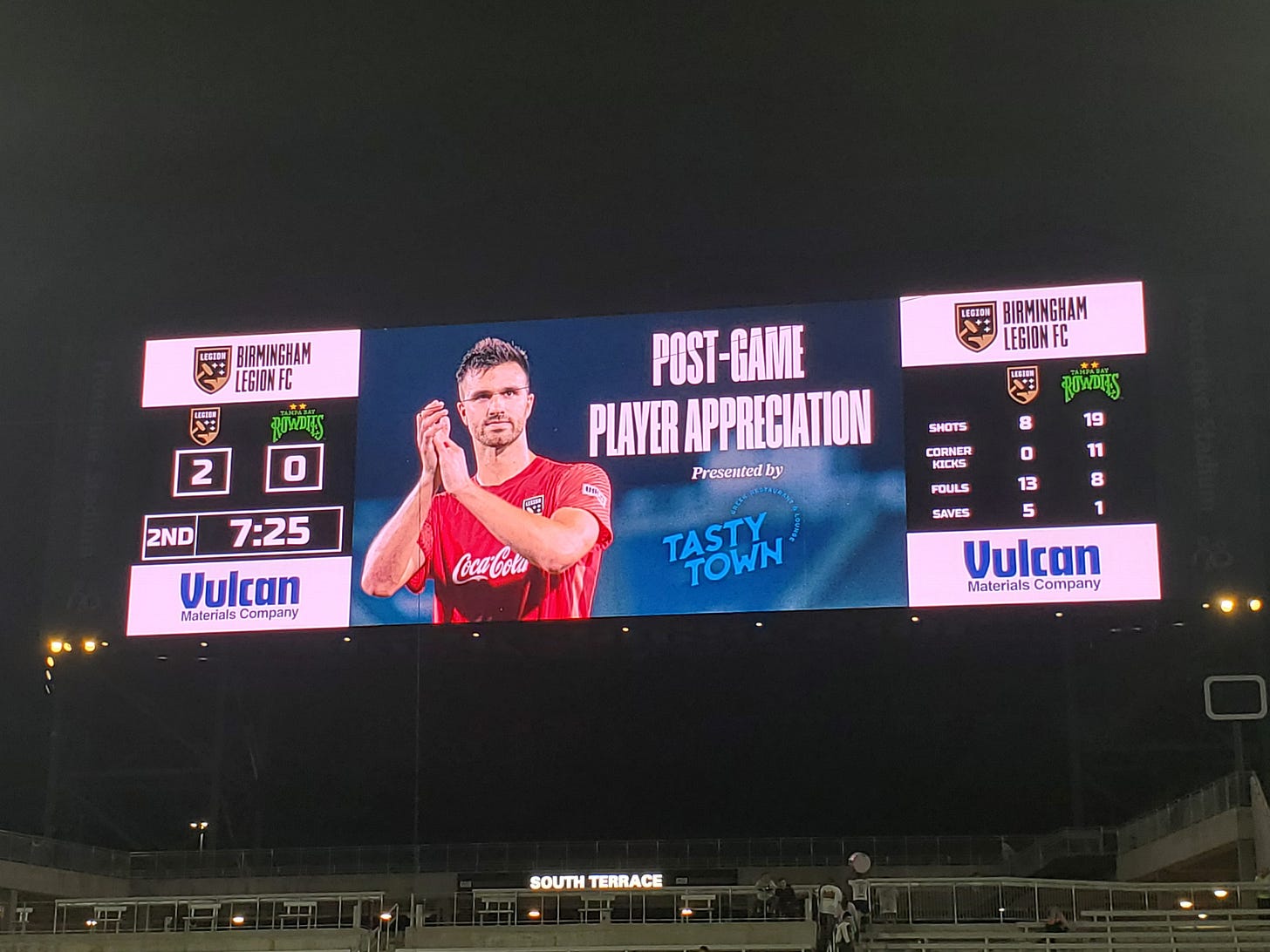 Legion had more players available than they've had in a long time. The only player that wasn't on the roster was team captain Kavita. He was there, and doesn't appear to be nursing an injury, and I believe just had some time on leave to be a dad with brand new twins. The starting lineup featured Diba Nwego, who has been injured for a couple of months, and Tyler Pasher, who has been out for about a month. Players returning from injury do not typically start under coach Soehn, but Legion needed to generate offense, and these players were key. Legion got the first goal of the night from a great run of play that saw Stefano Pinho get on the end of a great cross and bang it into the top of the goal. It was a rare first half goal from Legion, and the first goal after three games having none. Notably, Zouhir didn't start the game, for the first time since he arrived with the team, and midfield play was noticeably smoother. Legion took a 1-0 lead into the half. The second half began with Tampa Bay pressing forward harder than they had in the first half, and then they made an unusual four-man substitution around the 60 minute mark. It was a complete makeover of the lineup and the field that was designed to make a very hard push. Players like forwards Cal Jennings and Leo Fernandes came in fresh after being on the bench. Legion continued to move the ball well, creating chances of their own, and handling the Rowdies attack. Then in the 86th minute, Legion midfielder Kobe Hernandez-Foster wasn't marked just outside the box (the Rowdies looked like they expected him to pass the ball), and Kobe unleashed a low missile that squeaked inside the post for Birmingham's second goal. Legion rode that insurance goal to a 2-0 win.