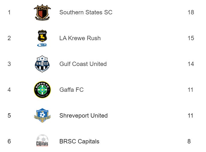 #4 Gaffa FC faces #5 Shreveport United in their final game. Gaffa can hop up to third place if they win, coupled with a GCU loss. A draw will see Gaffa remain in fourth place by virtue of GD, and will eliminate Shreveport from contention.