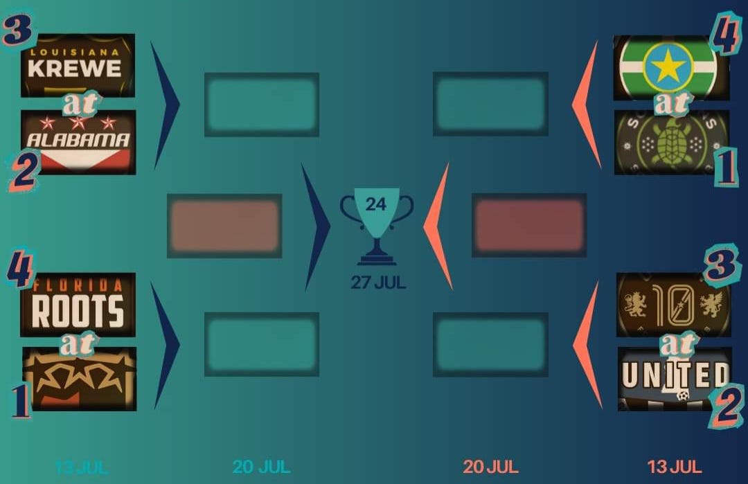 Union 10 were on the road to face Gulf Coast United. The Mobile, AL squad jumped out to an early lead, and looked to have the game well in hand with a 3-0 advantage at halftime. But GCU wasn't going to go quietly. They changed up their gameplan and dominated the second half. Regular time ended with the score knotted up 3-3. At the very beginning of overtime, Union 10 found the goal. They had to ride out the rest of overtime, and both teams finished with only ten men. Union held on to win 4-3. Union 10 came into the playoffs as a three seed. The fates are with them, and top-seeded Sowegans were upset by Gaffa. That means Union will be the home team for their second round match.