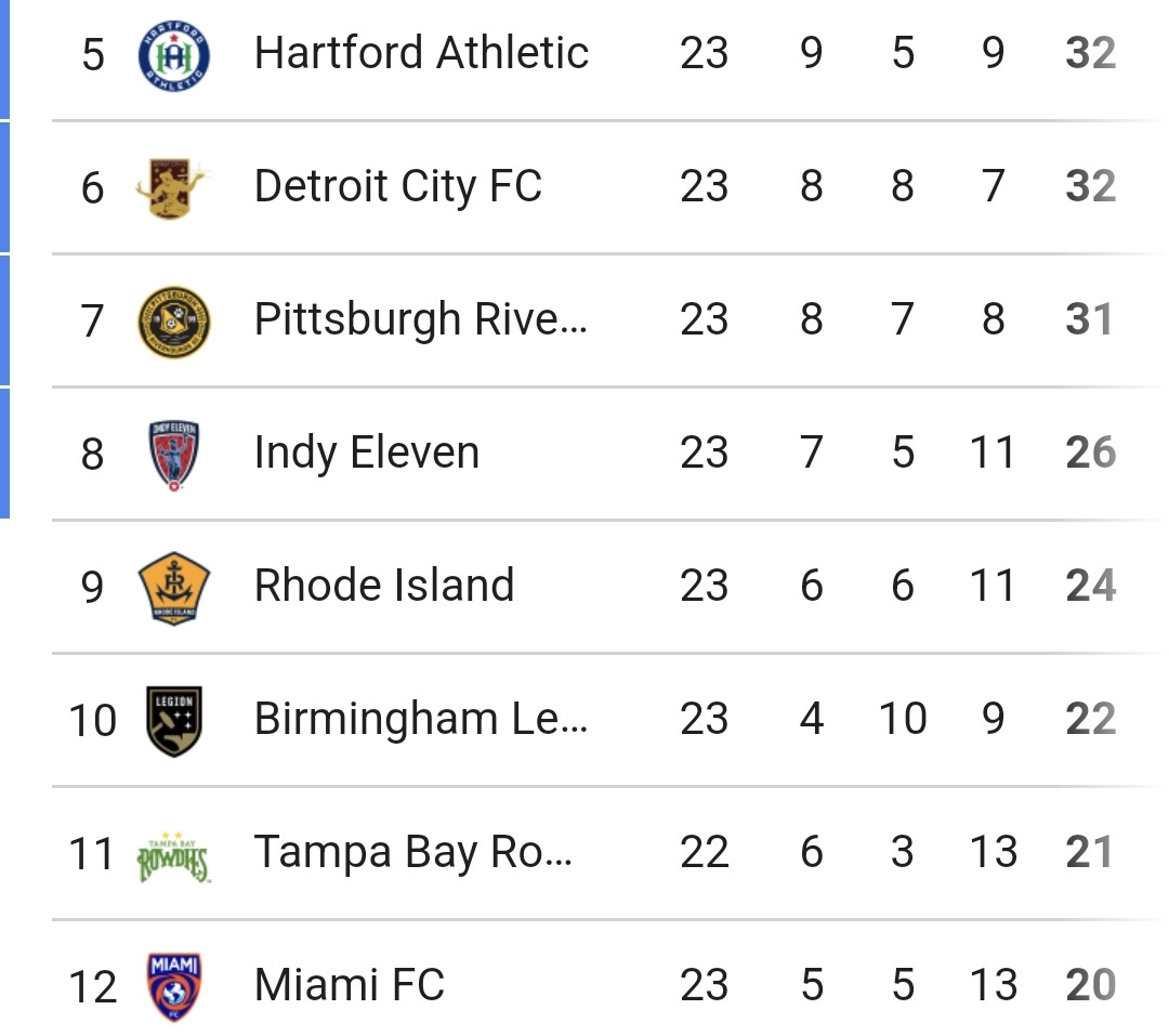 Birmingham's point against Tulsa enabled them to move up one position in the table, as the other teams from 8th to 12th all lost. On the other hand, the teams in 5th through 7th won, and increased their distance from the last playoff spot. Detroit and Hartford are in good form right now, and have moved to just one point behind North Carolina - the race will be tight for a home playoff position. Realistically, Birmingham's hope is just to overtake Indy for 8th place.