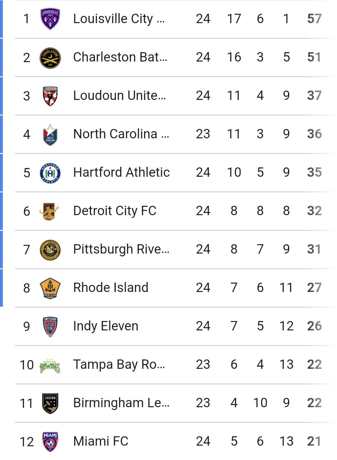 Meanwhile, the race for home field advantage has heated up, largely due to Hartford's amazing run of form. They've lost just once in the past thirteen league games, and have risen from the bottom of the table to fifth place, just one point away from a home playoff game position. Loudon and North Carolina are just ahead of Hartford, and Detroit City isn't out of the running. We've come to a place where it will be a surprise if Hartford doesn't host a playoff game.
