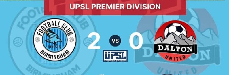 FC Birmingham was on the road to face Dalton United for the first round of the playoffs. Dalton was the obvious favorite, especially at home. But FC Birmingham managed to dominate the game, and came away with a 2-0 win.